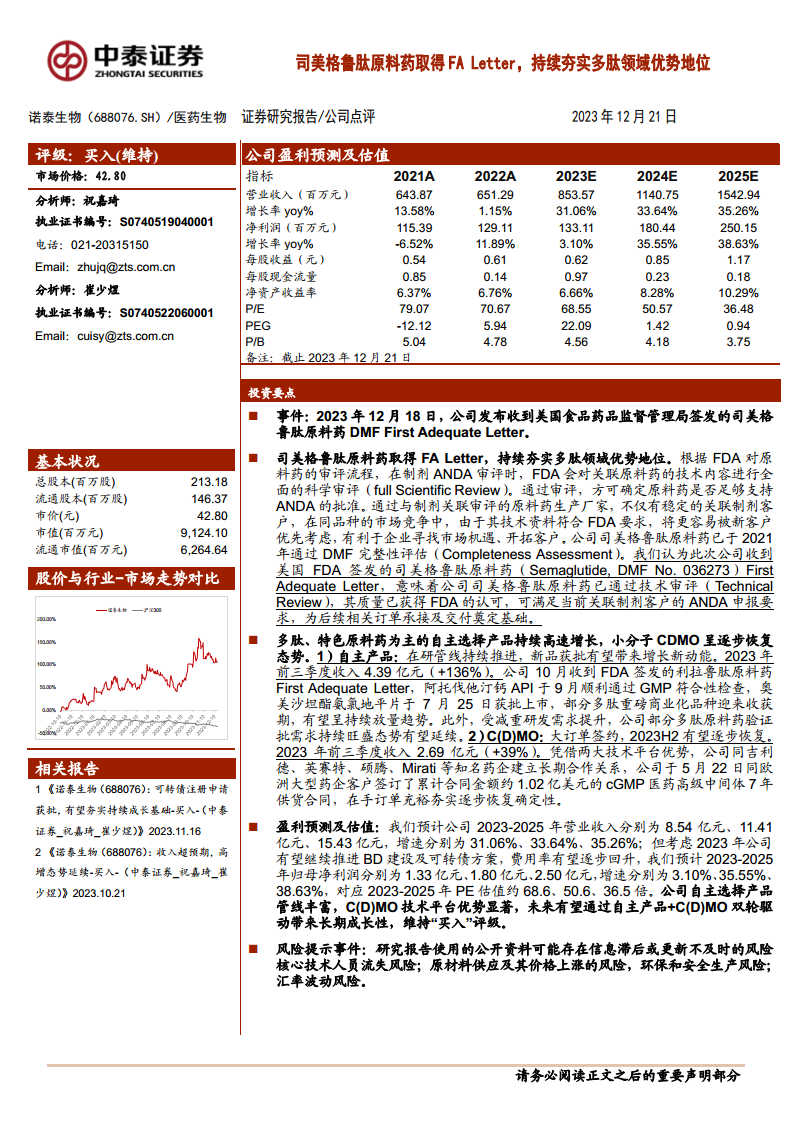 诺泰生物(688076.SH)于2023年12月18日收到美国食品药品监督管理局(FDA)签发的司美格鲁肽原料药DMF First Adequate Letter,标志着其司美格鲁肽原料药已通过FDA技术审评,质量获得认可,为公司在多肽领域的市场竞争和客户拓展奠定了坚实基础。此举不仅有望带来稳定的关联制剂客户,还将促进新客户的优先考虑,进一步巩固公司在多肽CDMO及自主产品市场的优势地位。