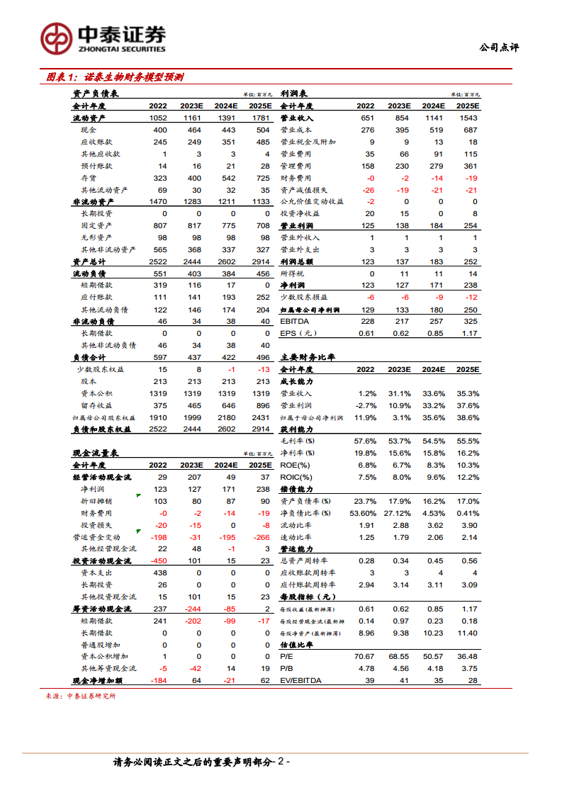 根据中泰证券的预测,诺泰生物的营业收入和归母净利润在未来三年将保持高速增长。