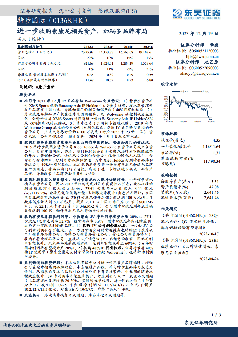 特步国际通过进一步收购索康尼相关资产,旨在全面掌控索康尼和迈乐品牌在中国内地、香港和澳门的运营权,以深化其多品牌战略并强化在专业跑步领域的市场地位。此次收购预计将直接提升公司报表利润率,通过整合合资公司剩余股权、优化供应链及节省知识产权使用费,中长期有望将合资公司净利润率提升至20%以上。尽管公司因双十一表现不及预期而下调了2023-2025年的归母净利润预测至10.2/12.8/15.5亿元,但鉴于此次收购的战略价值和对未来盈利能力的积极影响,分析师维持了“买入”评级。公司面临终端消费恢复不及预期和库存消化等风险。