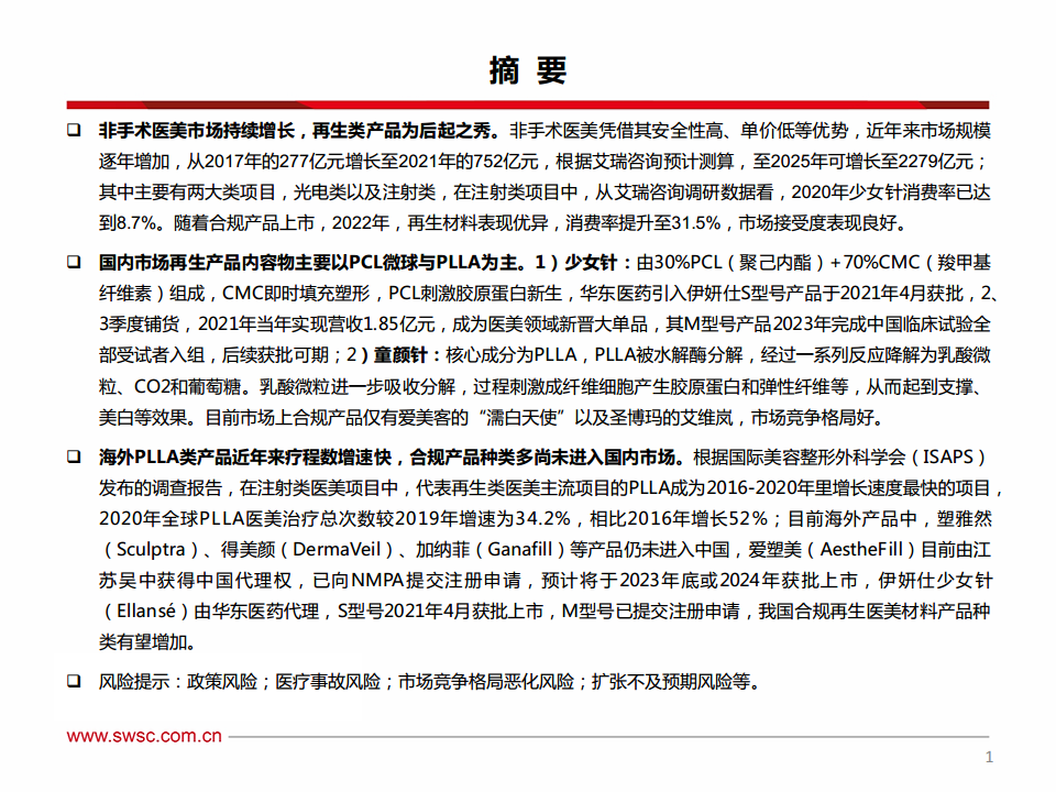 根据国际美容整形外科学会(ISAPS)报告,PLLA(聚左旋乳酸)是2016-2020年全球增速最快的注射类医美项目,2020年全球治疗总次数较2016年增长52%。海外市场拥有塑然雅(Sculptra)、得美颜(DermaVeil)、爱塑美(AestheFill)、加纳菲(Ganafill)等多款成熟产品。其中,爱塑美已向NMPA提交注册申请,伊妍仕少女针S型号已获批上市,M型号已提交注册申请,预示着我国合规再生医美材料产品种类有望增加。