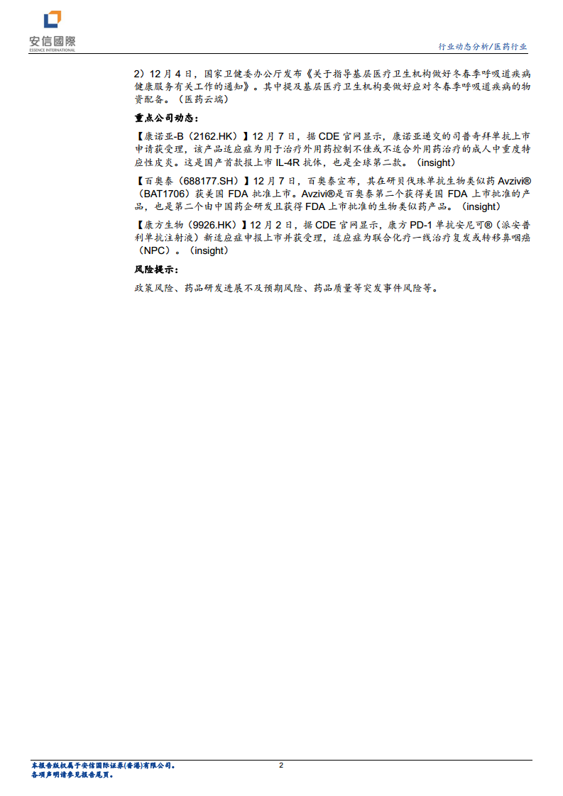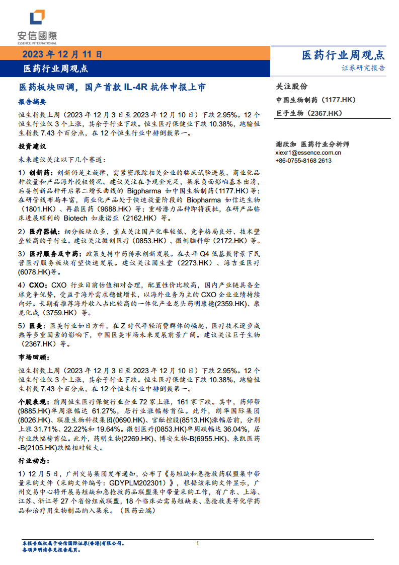 本报告核心观点指出,在2023年12月3日至12月10日期间,恒生医疗保健业表现显著承压,下跌10.38%,跑输恒生指数7.43个百分点,在12个恒生行业中排名倒数第一。尽管市场整体回调,但报告强调医药行业内部仍存在结构性投资机遇。未来投资应聚焦于创新药、医疗器械、医疗服务及中药、CXO和医美等细分赛道,这些领域在政策支持、技术进步和市场需求驱动下,展现出较强的增长潜力和配置价值。