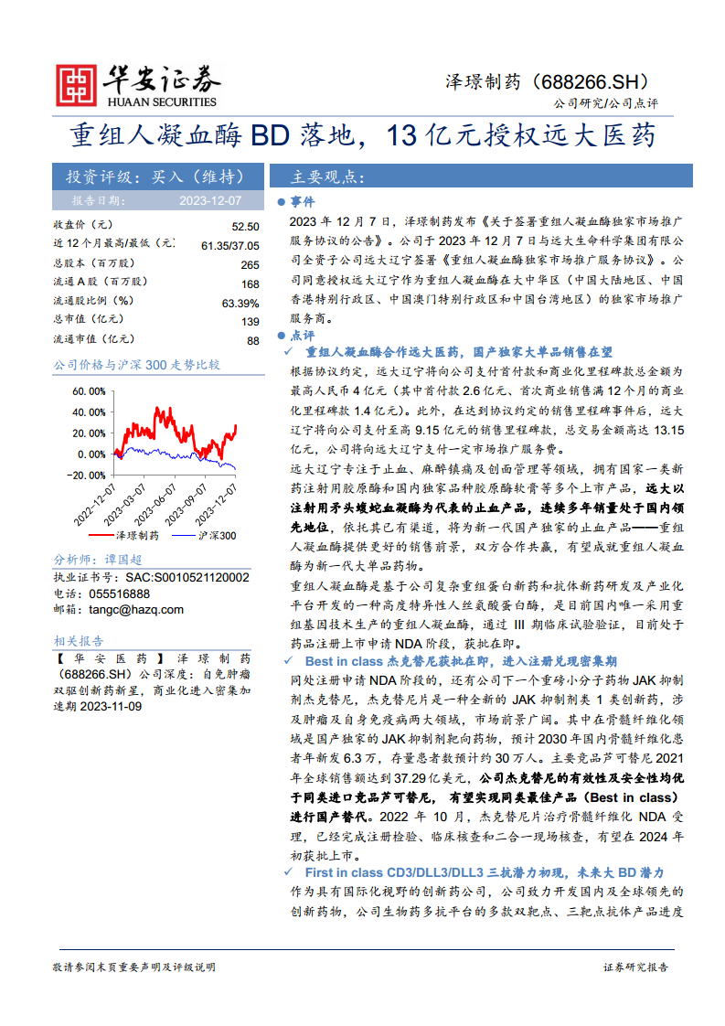2023年12月7日,泽璟制药发布公告,宣布与远大生命科学集团有限公司全资子公司远大辽宁签署《重组人凝血酶独家市场推广服务协议》。根据协议,泽璟制药同意授权远大辽宁作为重组人凝血酶在大中华区(包括中国大陆、香港、澳门和台湾地区)的独家市场推广服务商。此次合作的总交易金额高达人民币13.15亿元,其中包括最高4亿元的首付款和商业化里程碑款(首付款2.6亿元、首次商业销售满12个月的商业化里程碑款1.4亿元),以及在达到协议约定的销售里程碑事件后,远大辽宁将向公司支付至高9.15亿元的销售里程碑款。远大辽宁专注于止血、麻醉镇痛及创面管理等领域,拥有国家一类新药注射用胶原酶和国内独家品种胶原酶软膏等多个上市产品,其以注射用矛头蝮蛇血凝酶为代表的止血产品连续多年销量处于国内领先地位。此次合作有望凭借远大医药的强大渠道优势,将重组人凝血酶打造成为新一代国产独家的止血大单品。重组人凝血酶是基于泽璟制药复杂重组蛋白新药和抗体新药研发及产业化平台开发的一种高度特异性人丝氨酸蛋白酶,是目前国内唯一采用重组基因技术生产的重组人凝血酶,已通过III期临床试验验证,目前处于药品注册上市申请(NDA)阶段,获批上市在即。