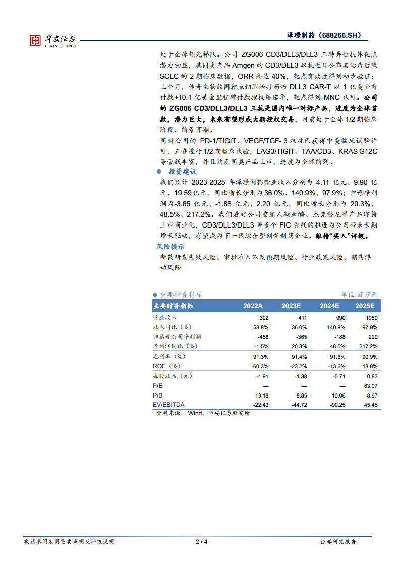 华安证券研究所预计泽璟制药2023-2025年营业收入将分别达到4.11亿元、9.90亿元和19.59亿元,同比增长率分别为36.0%、140.9%和97.9%,呈现高速增长态势。归属于母公司净利润预计分别为-3.65亿元、-1.88亿元和2.20亿元,预计公司将在2025年实现扭亏为盈。基于重组人凝血酶、杰克替尼等产品即将上市商业化,以及CD3/DLL3/DLL3等多个FIC管线的持续推进,公司有望成为下一代综合型创新制药企业,具备长期增长驱动力。因此,报告维持对泽璟制药的“买入”评级。同时,报告提示了新药研发失败、审批准入不及预期、行业政策及销售浮动等风险。