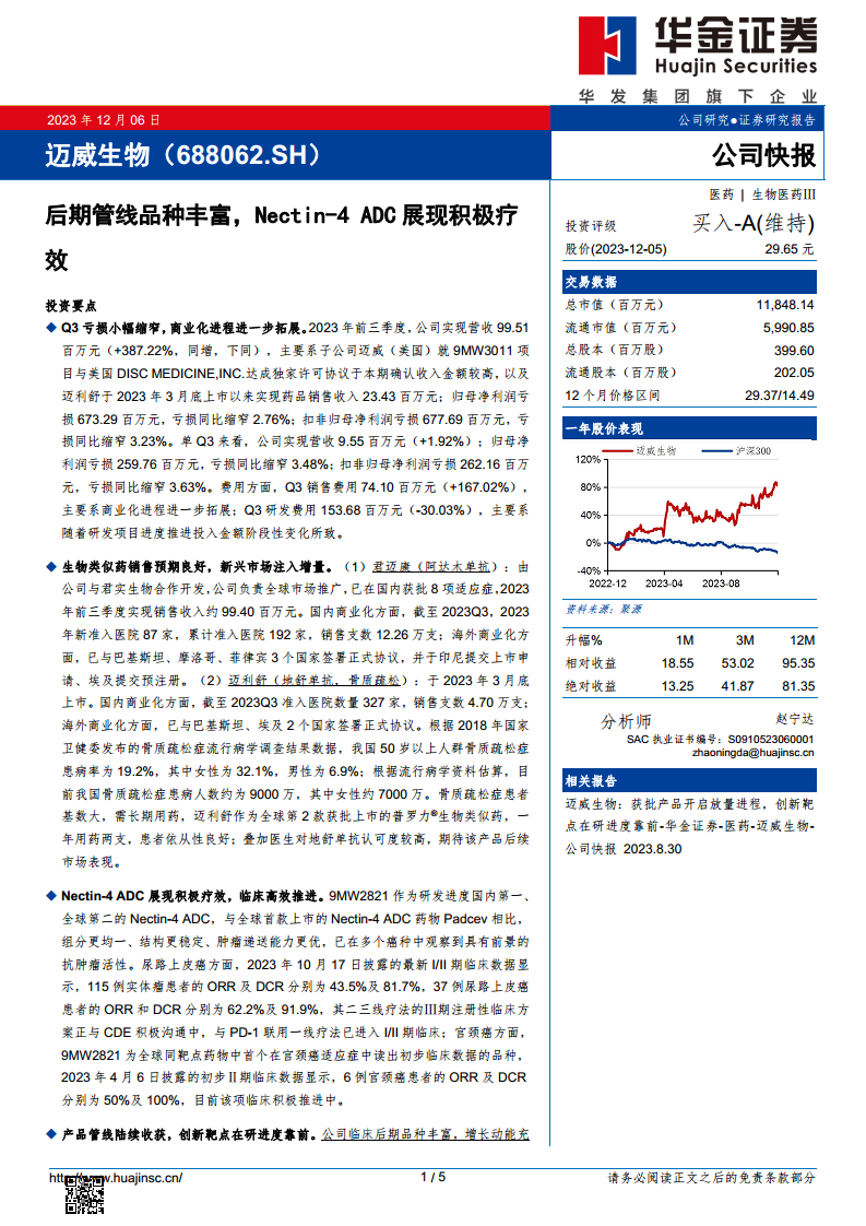 迈威生物在2023年前三季度通过许可协议和新上市产品销售实现了营收的显著增长,并成功缩窄了亏损幅度。公司在生物类似药领域,如君迈康和迈利舒,通过扩大医院准入和国际化布局,展现出良好的市场渗透和销售潜力。特别是在创新药管线方面,Nectin-4 ADC(9MW2821)在尿路上皮癌和宫颈癌中取得了积极的临床疗效数据,且多个后期管线品种有望陆续上市,为公司提供了充足的长期增长动能。此外,公司在CD47/PD-L1、ST2、TMPRSS6、IL-11等创新靶点以及基于IDDC™平台的ADC药物研发上均处于行业领先或第一梯队。尽管面临尚未盈利、研发及销售不及预期等风险,但鉴于其商业化进程的加速、丰富的产品管线和强大的研发实力,预计未来营收将实现高速增长,维持“买入-A”的投资评级。