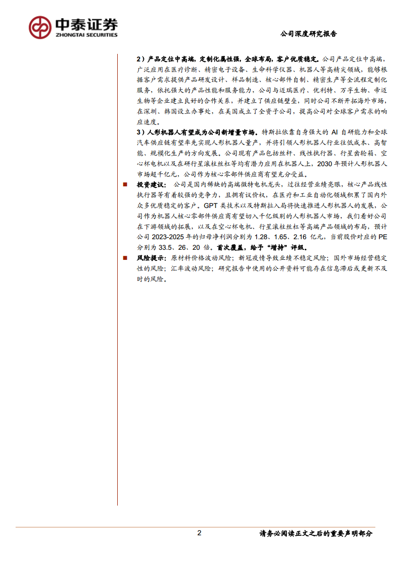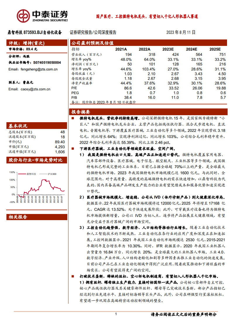 鼎智科技作为国产微特电机领域的领军企业,凭借其在精密运动控制领域15年的深耕和国家级专精特新“小巨人”的地位,实现了营收和净利润的持续高速增长。公司在医疗器械和工业自动化等下游市场需求旺盛的背景下,通过自主研发和技术创新,成功突破了丝杆、螺母、音圈电机和空心杯电机等核心零部件的技术垄断,产品性能达到国际先进水平。展望未来,随着GPT类AI技术和特斯拉等巨头推动人形机器人产业的快速发展,预计2030年人形机器人市场将达到千亿规模。鼎智科技凭借其在关键零部件领域的技术优势和量产能力,有望切入这一新兴市场,成为核心零部件供应商,进一步拓宽增长空间。鉴于公司稳健的业绩表现、强大的技术壁垒以及在人形机器人赛道的巨大潜力,我们首次覆盖并给予“增持”评级。