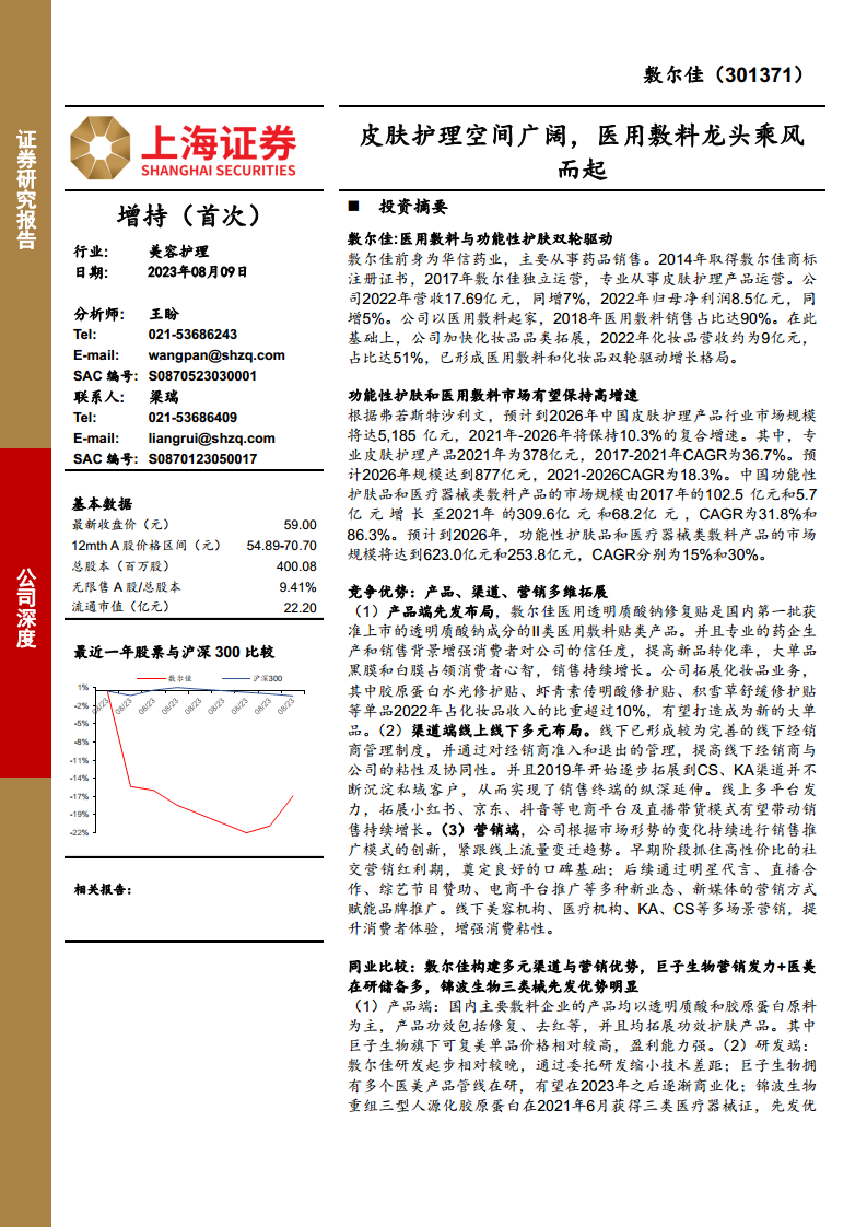 敷尔佳作为医用敷料领域的领先企业,已成功构建“医用敷料与功能性护肤”双轮驱动的增长格局。公司凭借在透明质酸钠医用敷料领域的先发优势和强大的品牌心智,稳固了其在专业皮肤护理市场的龙头地位。同时,通过积极拓展化妆品品类,功能性护肤业务已成为公司营收的重要组成部分,并在2022年贡献了超过一半的收入,有效分散了单一业务风险,并为公司提供了新的增长引擎。