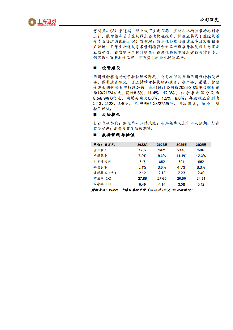 - 归母净利润: 2022年,敷尔佳归母净利润8.5亿元(yoy+5%),巨子生物10亿元(yoy+21%),锦波生物1.1亿元(yoy+90%)。