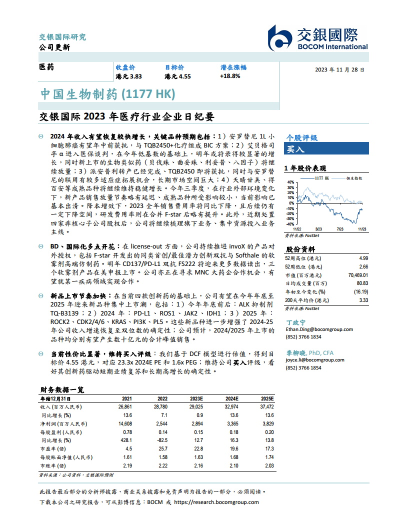 根据交银国际的预测,中国生物制药的收入预计将从2023年的290.25亿元人民币增长至2025年的374.72亿元人民币,年复合增长率达到13.6%。净利润预计从2023年的28.94亿元人民币增长至2025年的38.29亿元人民币,年复合增长率分别为16.3%和13.8%。报告采用DCF模型进行估值,得出目标价4.55港元,对应2024年预测市盈率(PE)23.3倍和市盈增长率(PEG)1.6倍。这一估值水平被认为具有显著性价比。