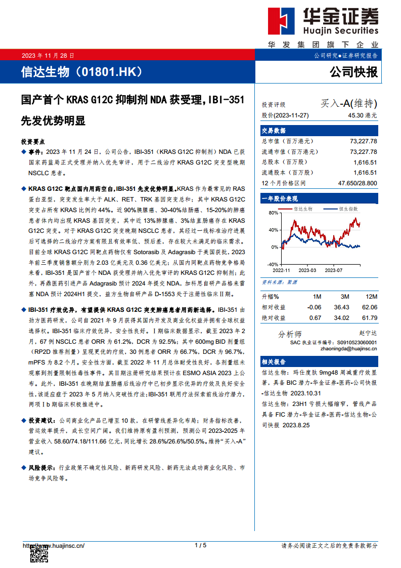 信达生物凭借其国产首个KRAS G12C抑制剂IBI-351的NDA获受理并纳入优先审评,在国内KRAS G12C突变型晚期NSCLC治疗领域占据了重要的先发优势。IBI-351在临床试验中展现出卓越的疗效和安全性,有望满足巨大的未被满足的临床需求,并具备拓展至其他适应症的潜力。公司整体商业化产品线丰富,在研管线布局差异化,营运效率持续提升,财务状况预计将稳步改善,营收保持高速增长,亏损持续收窄。尽管存在行业政策、新药研发和市场竞争等风险,但公司凭借其创新能力和市场布局,展现出广阔的成长前景,维持“买入-A”的投资评级。