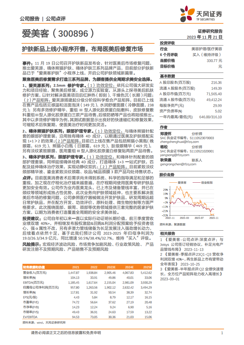 爱美客此次推出三大系列护肤新品,标志着公司成功拓展至医美后修复市场,进一步完善了其在医美领域的全周期服务布局。凭借其在研发、产品和市场方面的深厚积累,公司有望在这一新兴市场中占据领先地位。结合2023年前三季度强劲的业绩增长和积极的财务展望,爱美客展现出显著的长期投资价值和持续增长潜力。尽管存在宏观经济波动和市场竞争等风险,但公司稳健的经营策略和不断创新的产品管线,使其在医美行业中保持强劲的“买入”评级。