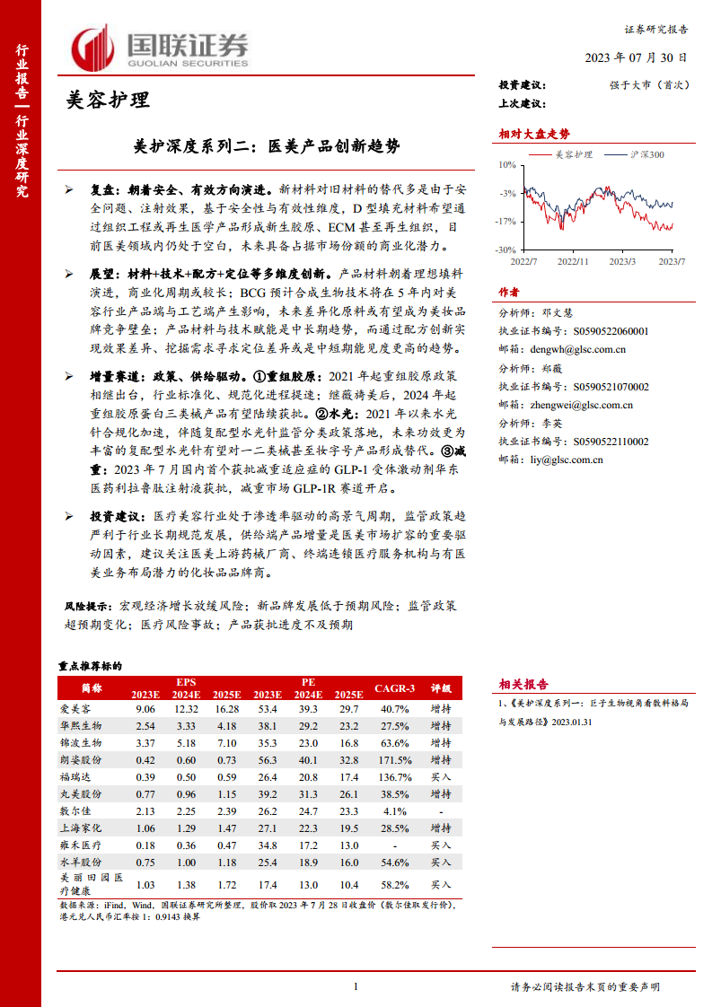 本报告深入分析了美容护理行业,特别是医美产品创新趋势。报告指出,医美市场正朝着安全、有效的方向演进,并由材料、技术、配方和定位等多维度创新驱动。政策支持和供给端产品丰富催生了重组胶原、水光针和减重等增量赛道。在产品材料方面,干细胞和外泌体仍处于研究阶段,商业化周期较长,而PRP在海外已有一定应用,ADM商业化进展缓慢。技术创新方面,合成生物学有望带来原料差异化,配方创新则实现效果差异化,需求挖掘推动产品定位精细化。随着监管政策的落地和新产品的不断获批,医美市场将持续扩容,为上游药械厂商、中游连锁机构和有医美布局的化妆品品牌商带来投资机遇。
