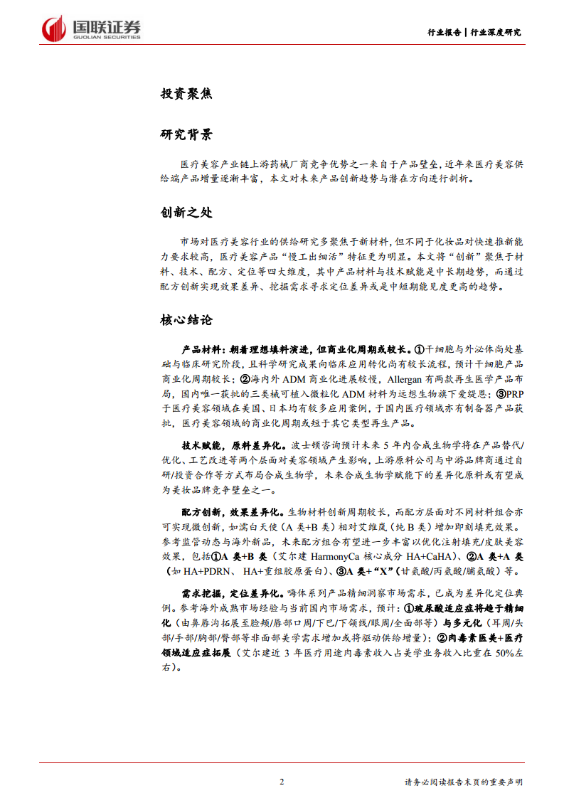 本报告核心观点指出,医疗美容行业正处于由渗透率驱动的高景气周期,其发展方向持续朝着安全性和有效性演进。市场创新不再局限于单一维度,而是呈现出材料、技术、配方和定位等多维度协同创新的趋势。其中,产品材料和技术赋能是中长期发展方向,而配方创新和需求挖掘带来的定位差异化则是中短期内更具可见性的趋势。