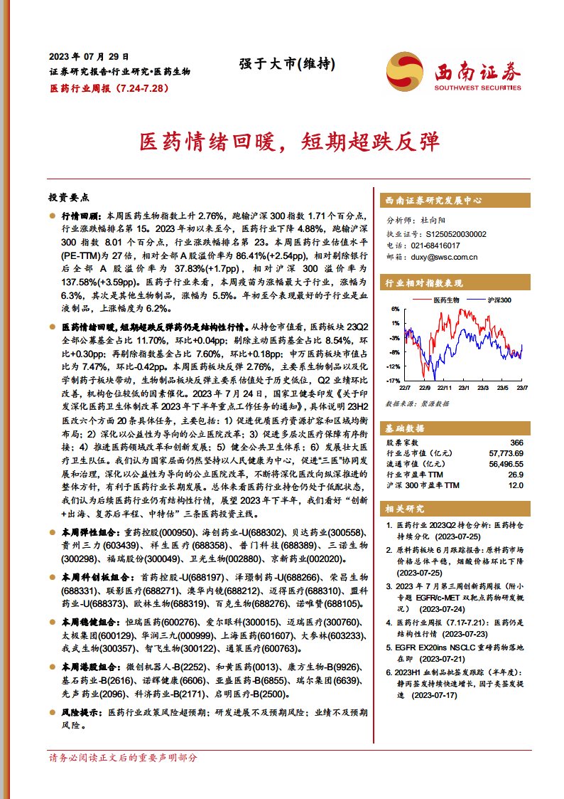 政策层面,国家卫健委于7月24日印发《深化医药卫生体制改革2023年下半年重点工作任务的通知》,明确了六个方面20条具体任务,包括促进优质医疗资源扩容、深化公立医院改革、促进多层次医疗保障衔接、推进医药领域改革创新、健全公共卫生体系以及发展壮大医疗卫生队伍。报告认为,国家层面坚持以人民健康为中心,深化医改的整体方针有利于医药行业长期发展。