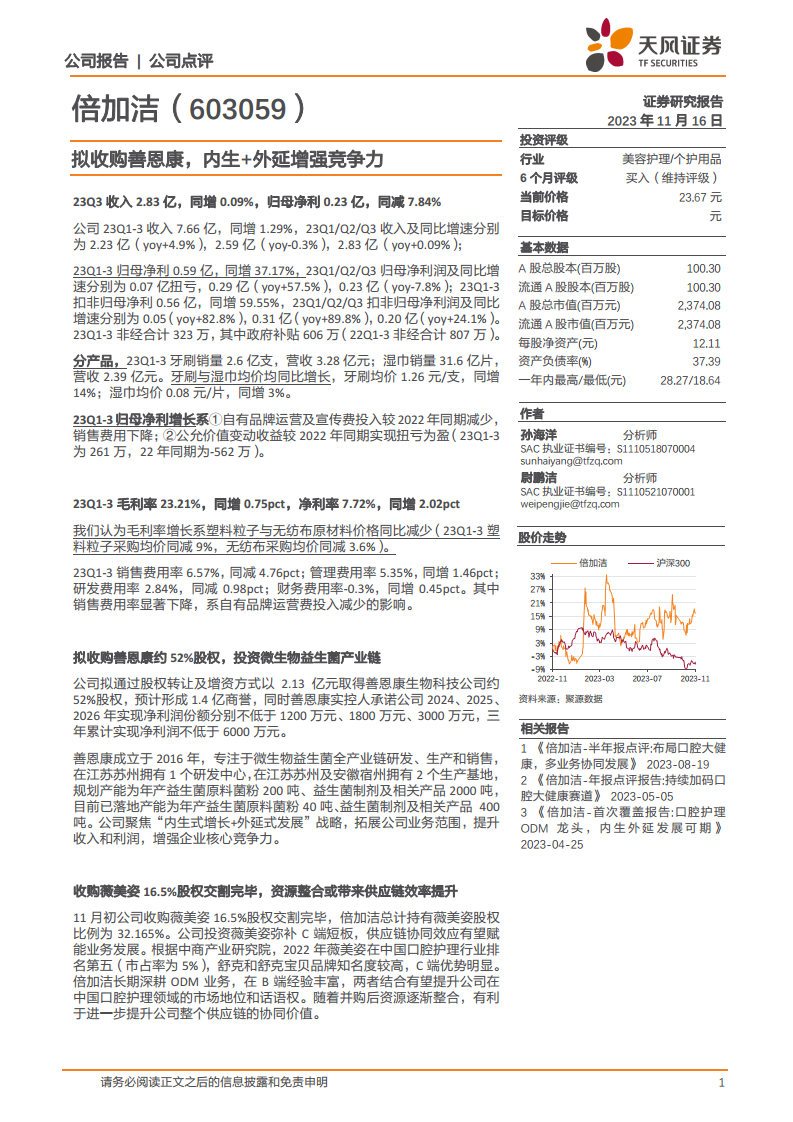倍加洁公司通过内生增长和外延并购双轮驱动,持续增强其在口腔护理和个护用品市场的竞争力。2023年前三季度,公司归母净利润同比增长37.17%,主要得益于销售费用控制和原材料成本下降。战略性收购善恩康将拓展微生物益生菌产业链,而增持薇美姿股权则强化了公司在口腔护理C端的市场地位和供应链协同效应。公司现有口腔清洁护理和一次性卫生用品两大产品系列,并聚焦大客户开发。分析师维持“买入”评级,预计未来三年盈利将持续增长,但需关注原材料价格波动、市场竞争及并购不确定性等风险。
