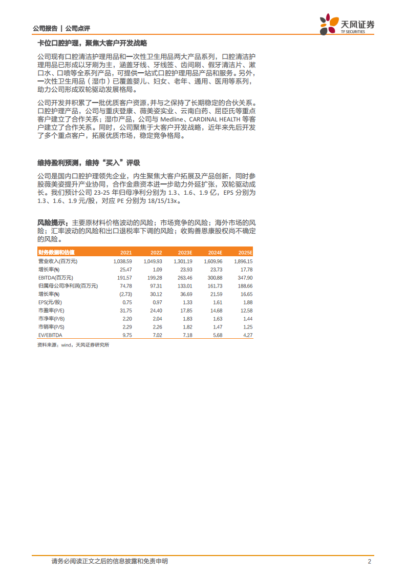 分析师维持对倍加洁的“买入”评级。预计公司2023-2025年归母净利润分别为1.3亿元、1.6亿元、1.9亿元,对应的每股收益(EPS)分别为1.3元、1.6元、1.9元,对应市盈率(PE)分别为18倍、15倍、13倍。