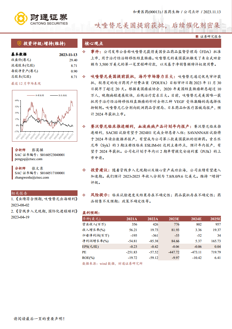 和黄医药(00013):呋喹替尼美国提前获批,后续催化剂密集