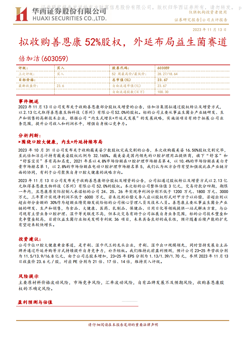 公司在口腔大健康黄金赛道中占据有利位置,是牙刷、湿巾代工的龙头企业,出口规模领先。同时,公司坚持发展自主品牌,并通过外延并购持续提升竞争力。分析师维持此前的盈利预测,预计公司2023-2025年营收分别为11.5亿元、13.9亿元、16.8亿元,由于总股本增加,2023-2025年EPS分别为1.13元、1.39元、1.70元。参照2023年11月13日收盘价23.6元/股,对应PE分别为21倍、17倍、14倍,维持“买入”评级。