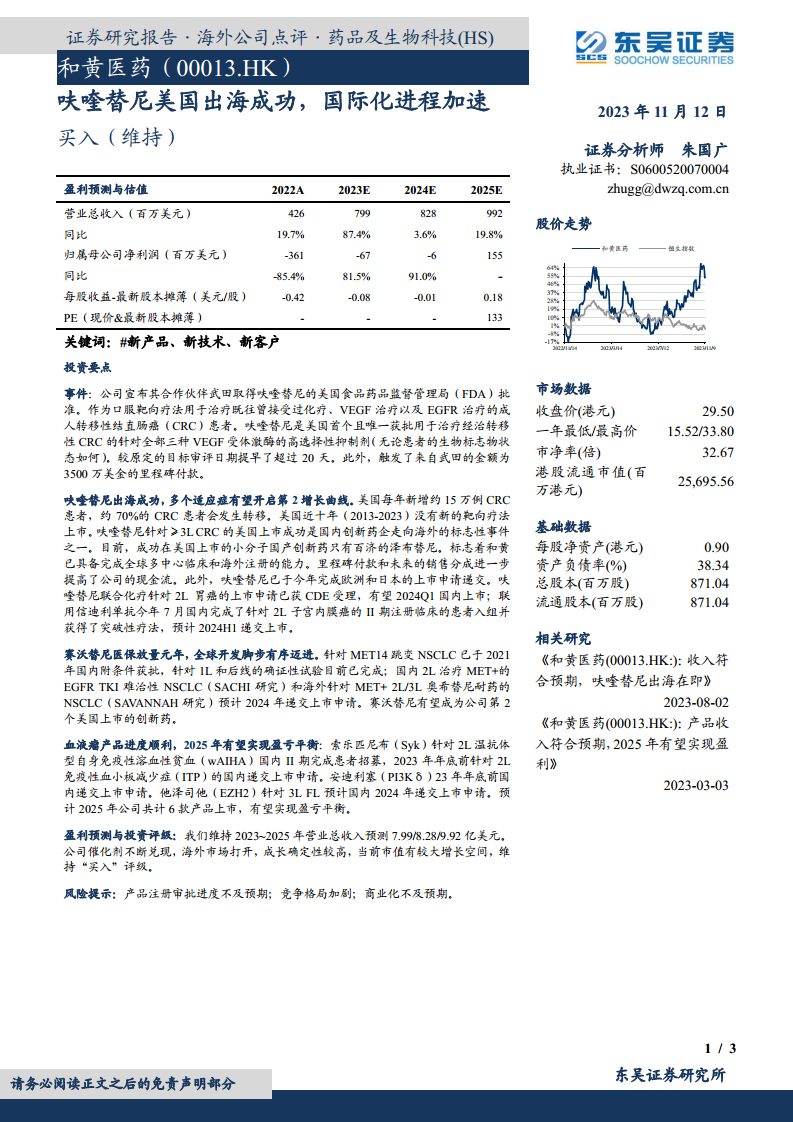 和黄医药(00013):呋喹替尼美国出海成功,国际化进程加速