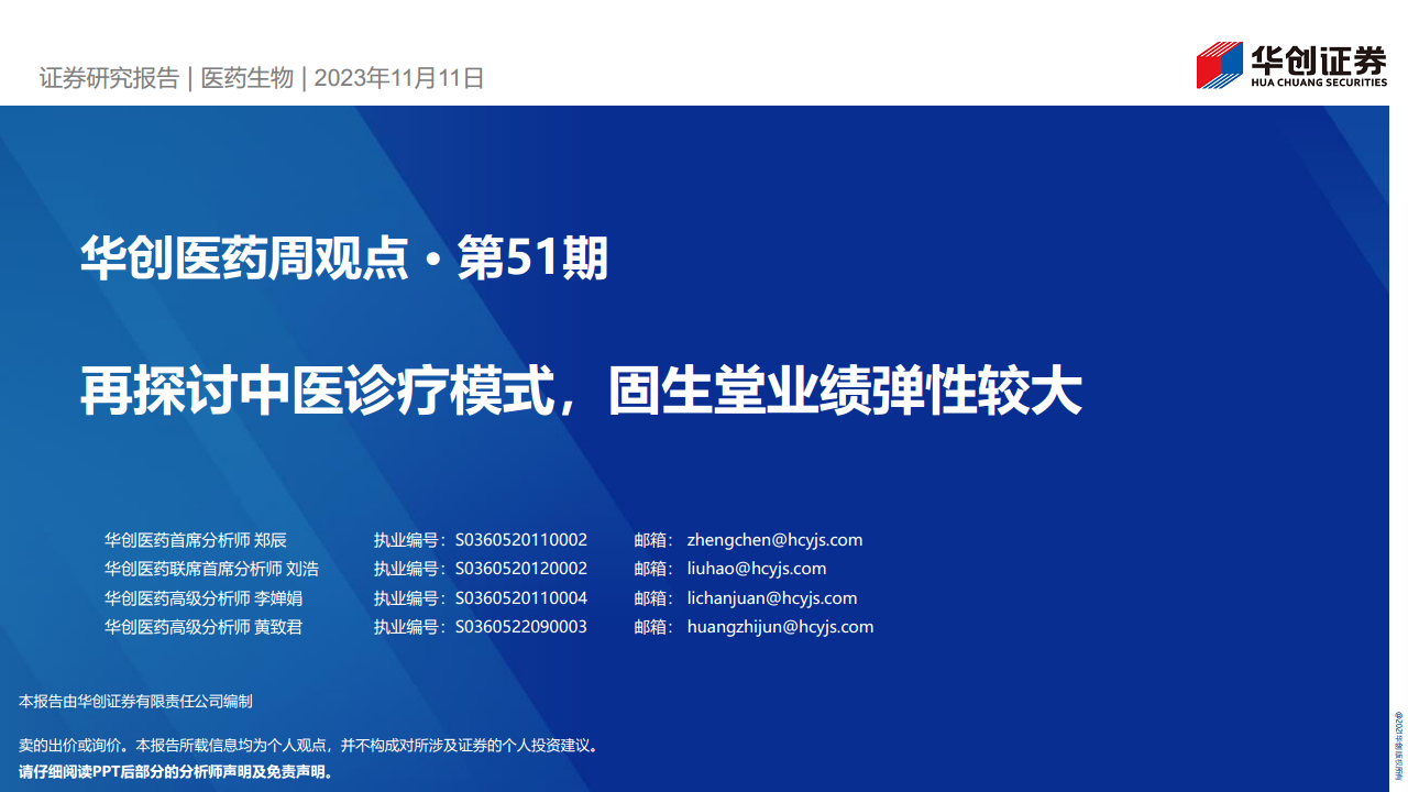 华创医药周观点第51期:再探讨中医诊疗模式,固生堂业绩弹性较大