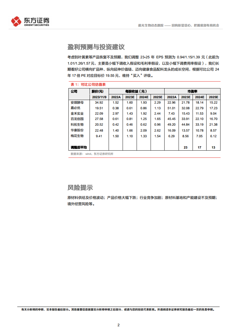 鉴于叶黄素等产品恢复不及预期,分析师对公司2023-2025年的每股收益(EPS)预测进行了调整,分别为0.94元、1.15元和1.39元(此前预测为1.01元、1.26元和1.57元),主要调整了收入和毛利率假设,并小幅下调了费用率假设。尽管如此,报告长期看好晨光生物通过“横向扩品种、纵向延伸价值链”的战略,逐步迈向健康食品配料龙头的成长空间。基于可比公司2024年17倍PE的估值,维持目标价19.55元,并重申“买入”评级。