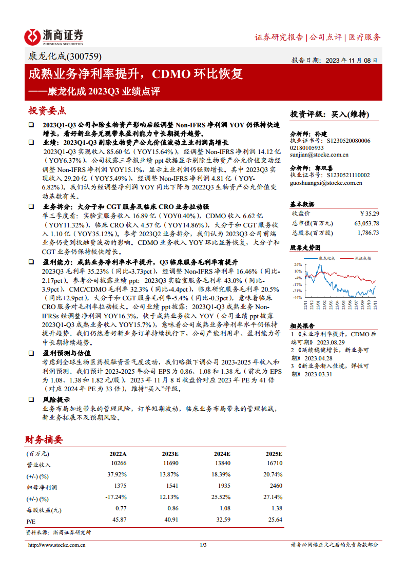 康龙化成(300759):2023Q3业绩点评:成熟业务净利率提升,CDMO环比恢复