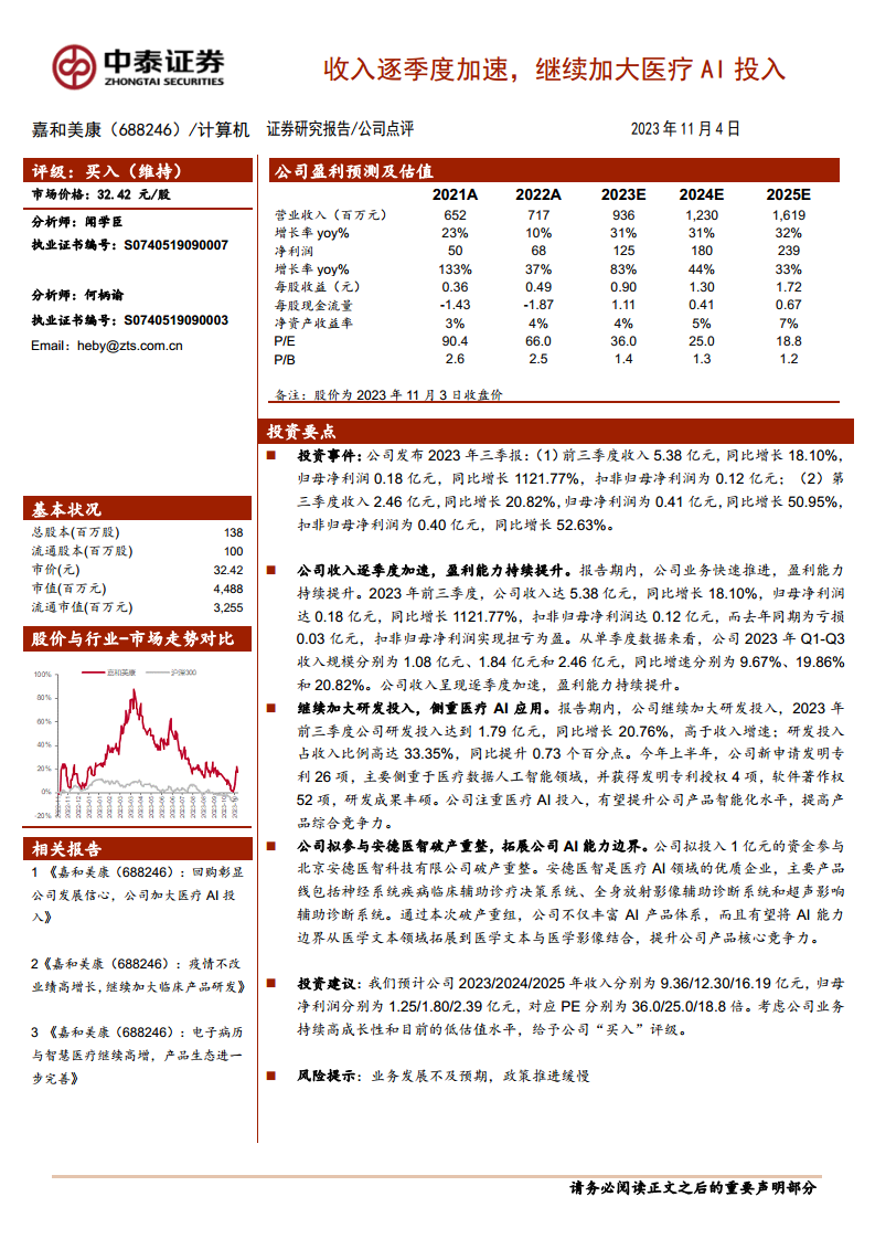 嘉和美康在2023年前三季度表现出强劲的增长势头,收入逐季度加速,盈利能力显著提升,扣非归母净利润实现扭亏为盈。公司持续加大研发投入,尤其在医疗AI领域进行战略性布局,通过自主研发和参与安德医智破产重整,旨在拓展AI能力边界,提升产品智能化水平和核心竞争力。分析师基于公司持续高成长性和低估值水平,维持“买入”评级,并对未来业绩持乐观预期,但同时提示了业务发展不及预期和政策推进缓慢的风险。