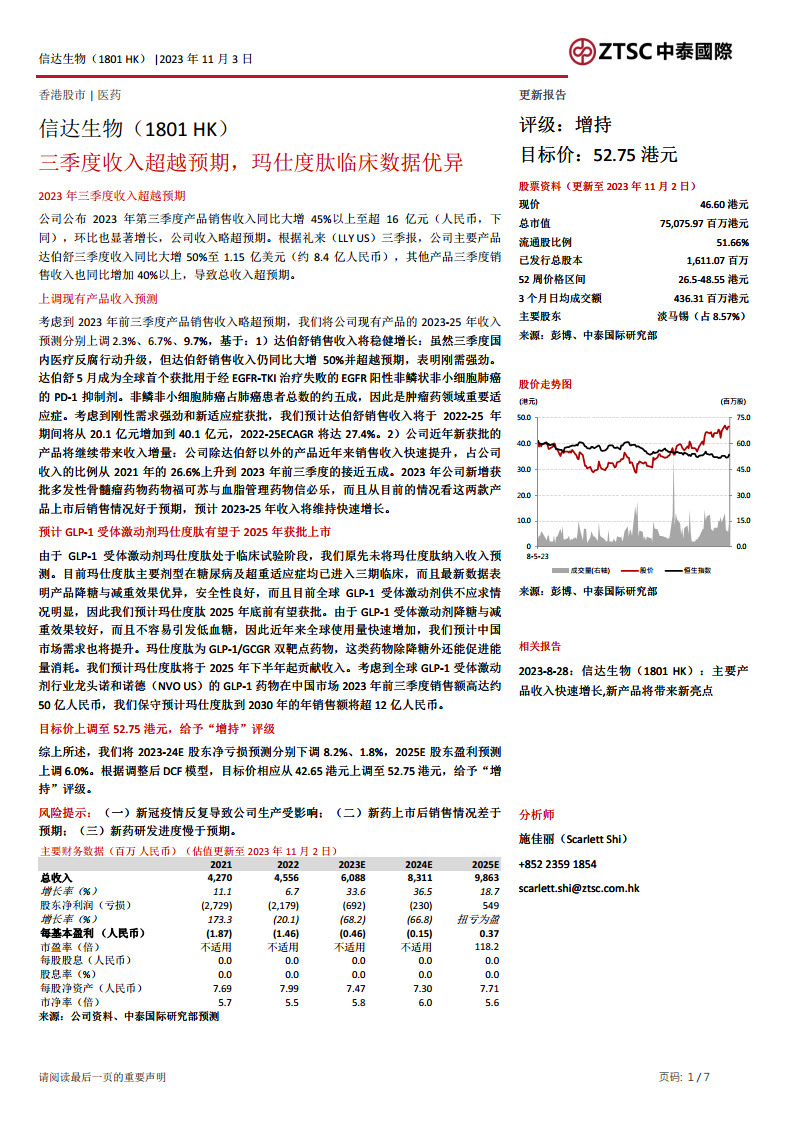 信达生物(01801):三季度收入超越预期,玛仕度肽临床数据优异