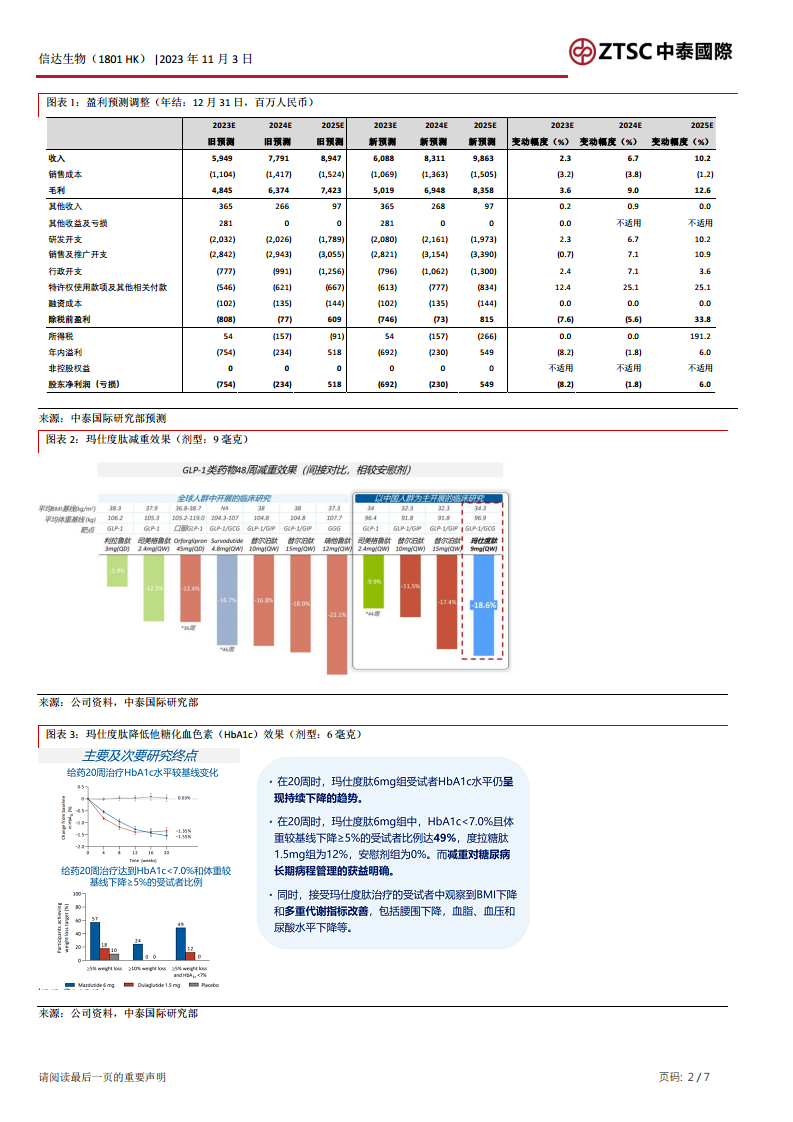 综合上述现有产品销售的超预期表现、新产品线的快速增长以及创新管线玛仕度肽的积极进展,分析师对信达生物的财务预测进行了全面调整。具体而言,2023年和2024年的股东净亏损预测分别下调了8.2%和1.8%,反映了公司盈利能力的改善和亏损收窄的趋势。更重要的是,2025年的股东盈利预测则上调了6.0%,预示着公司有望在2025年实现扭亏为盈,进入盈利增长的新阶段。