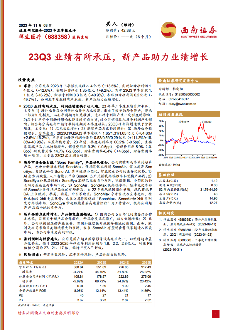 祥生医疗在2023年前三季度整体业绩保持增长,但第三季度受汇率波动和订单延期等外部因素影响,短期业绩有所承压。公司通过持续优化产品结构,提升高端产品占比,并积极拓展海外市场,构建了以“Sono Family”为核心的全球化产品体系。同时,与飞利浦的合作以及在医美、兽用等新应用领域的拓展,为公司未来业绩增长注入了新动能。尽管存在研发和汇率波动等风险,但鉴于其在国产超声影像设备领域的领先地位和清晰的全球化及产品创新战略,分析师维持“买入”评级,看好公司中长期发展潜力。