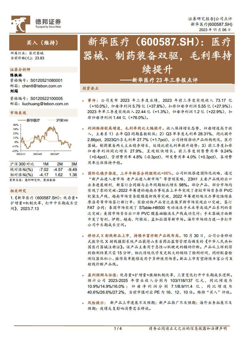新华医疗在2023年前三季度取得了令人瞩目的业绩,营业收入和归母净利润均实现双位数增长,特别是归母净利润同比大增37.8%,主要得益于公司产品结构优化带来的毛利率显著提升。公司积极推进国际化战略,上半年海外新签合同额同比增长98%,成功拓展了多个海外市场,为未来的中长期增长奠定了坚实基础。同时,移动式数字化X射线摄影系统等新产品的上市,进一步丰富了公司诊断产品线,增强了市场竞争力。财务预测显示,公司未来几年营收和净利润将保持稳健增长,盈利能力指标持续向好,估值具有吸引力。综合来看,新华医疗凭借其“优存量+扩增量+机制改革”的策略,有望实现中长期成长,因此报告维持“买入”评级。