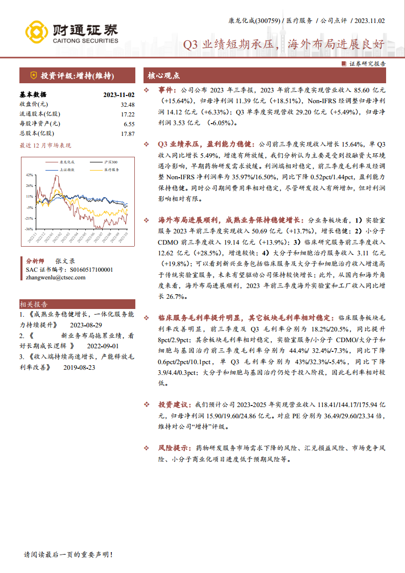 康龙化成在2023年第三季度面临宏观环境带来的短期业绩压力,营收增速放缓且归母净利润出现同比下滑。然而,公司通过积极的海外市场拓展和新兴业务(如临床研究服务、大分子和细胞治疗服务)的快速增长,展现出强大的战略韧性和长期发展潜力。特别是海外业务收入的显著增长和临床服务毛利率的提升,为公司未来的持续增长提供了坚实支撑。尽管大分子和细胞治疗服务仍处于投入期,但其快速的收入增长预示着未来的发展空间。综合来看,报告维持了对康龙化成“增持”的投资评级,认为公司在应对短期挑战的同时,其多元化业务布局和海外战略将驱动其实现稳健增长。投资者需关注药物研发市场需求、汇兑损益及市场竞争等潜在风险。