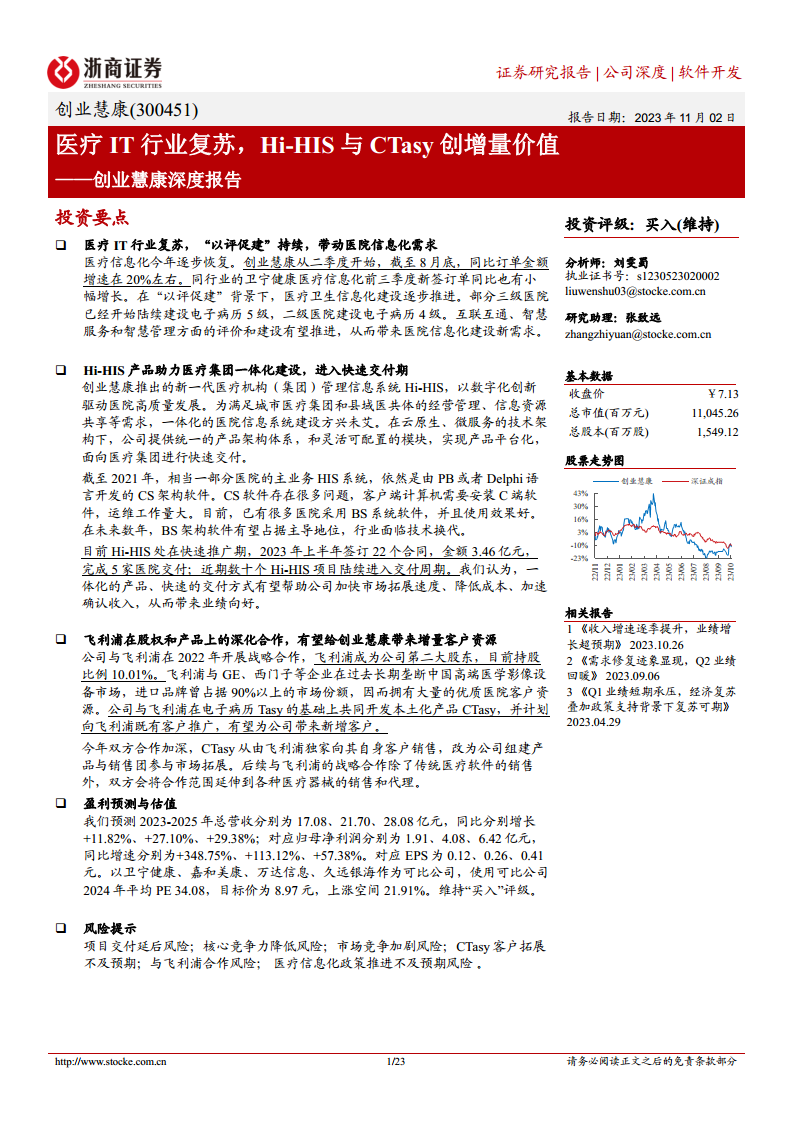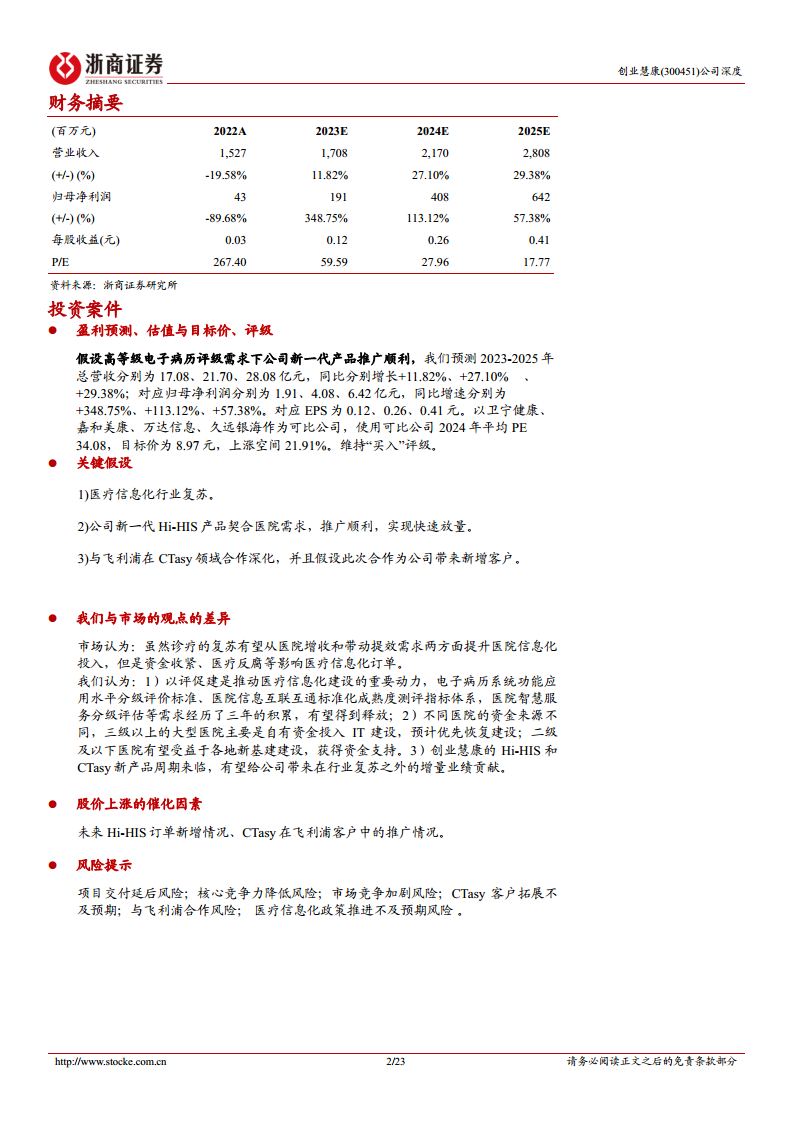 - 预计2023-2025年总营收分别为17.08亿元(同比+11.82%)、21.70亿元(同比+27.10%)、28.08亿元(同比+29.38%)。其中,医疗行业信息化收入预计分别为15.62亿元(同比+14.73%)、20.14亿元(同比+28.94%)、26.44亿元(同比+31.27%),主要得益于医院端订单复苏、Hi-HIS和CTasy等新产品加速推广及交付周期缩短。