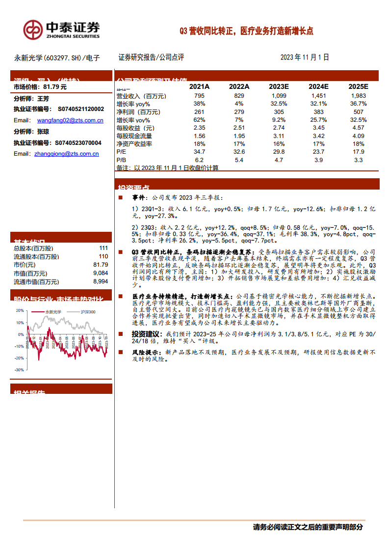 永新光学(603297):Q3营收同比转正,医疗业务打造新增长点