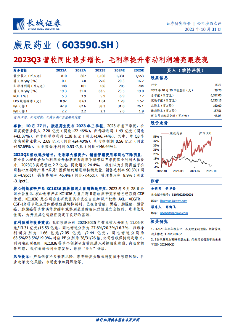 报告强调,康辰药业的创新研发管线取得积极进展,核心创新产品KC1036在儿童用药适应症方面已进入关键临床阶段,其II期临床研究申请获得CDE受理,预示着公司未来增长的潜力。分析师基于对公司稳定增长的营收、强劲的利润表现和 promising 创新管线的信心,维持了“买入”评级。