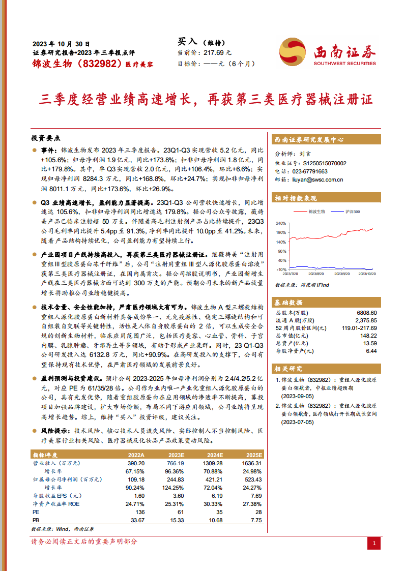 本报告核心观点指出,锦波生物在2023年第三季度展现出强劲的经营业绩增长势头,其营收和归母净利润均实现翻倍增长。公司盈利能力显著提升,主要得益于高毛利注射剂产品占比的持续提高以及重组人源化胶原蛋白核心技术的领先优势。