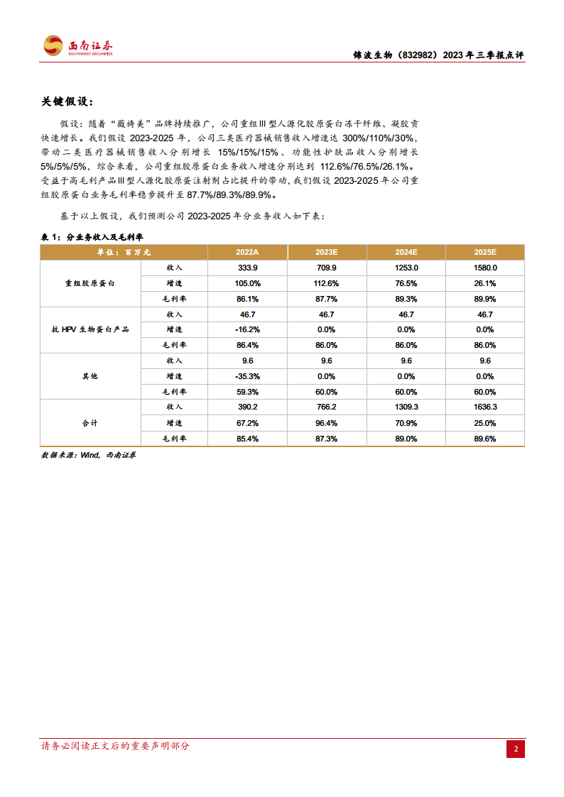报告对锦波生物未来的业绩增长做出了关键假设。假设“薇旖美”品牌将持续推广,重组Ⅲ型人源化胶原蛋白冻干纤维和凝胶产品将贡献快速增长。