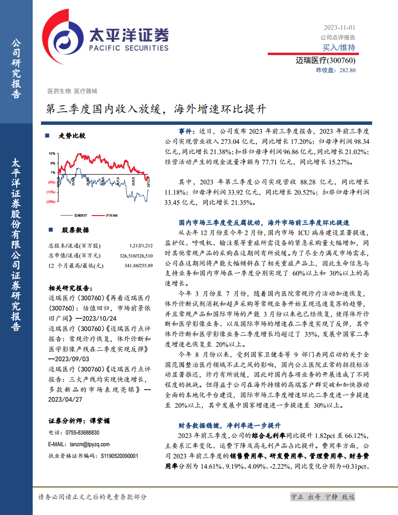 迈瑞医疗(300760):第三季度国内收入放缓,海外增速环比提升