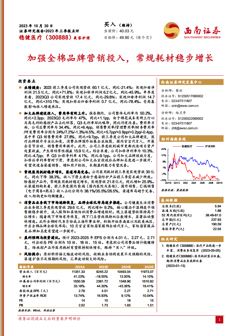 根据西南证券的盈利预测,稳健医疗2023-2025年的每股收益(EPS)预计分别为4.01元、2.27元和2.71元,对应的动态市盈率(PE)分别为10倍、18倍和15倍。考虑到公司消费品业务预计将稳健修复,以及除疾控产品外医用耗材有望保持较快增长,分析师维持“买入”评级,并给予2024年22倍估值,对应目标价49.90元(6个月)。