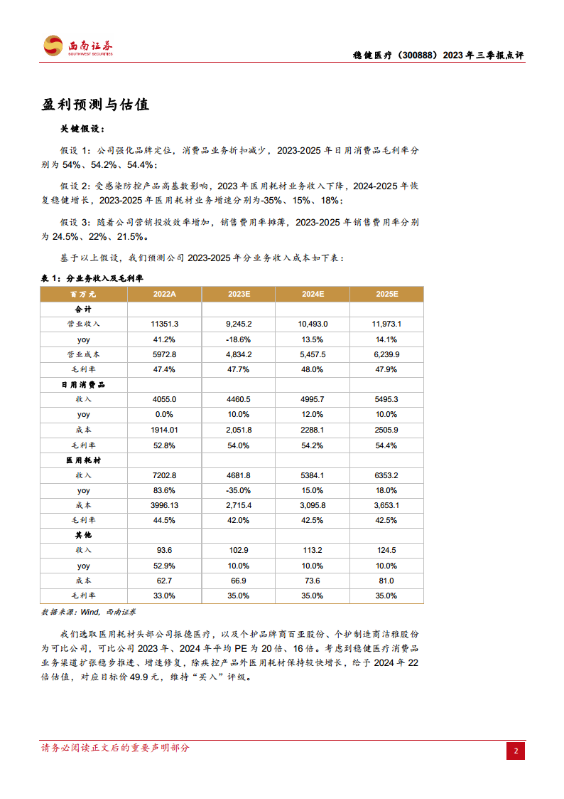 在关键假设方面,分析师预计2023-2025年日用消费品毛利率将因品牌强化和折扣减少而逐步提升至54.4%;医用耗材业务在2023年受高基数影响收入下降35%后,2024-2025年将恢复稳健增长,增速分别为15%和18%;销售费用率则随着营销投放效率的增加而摊薄,预计2025年降至21.5%。