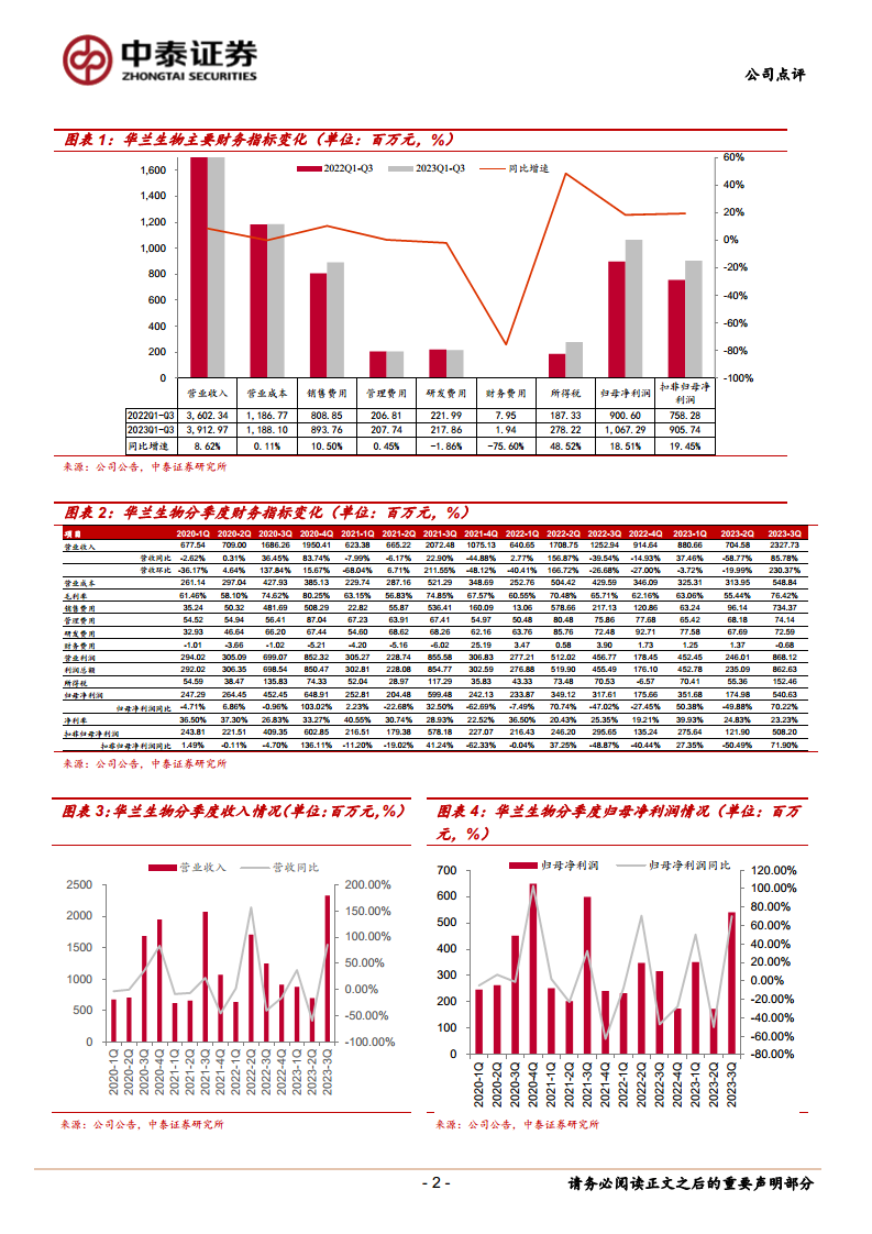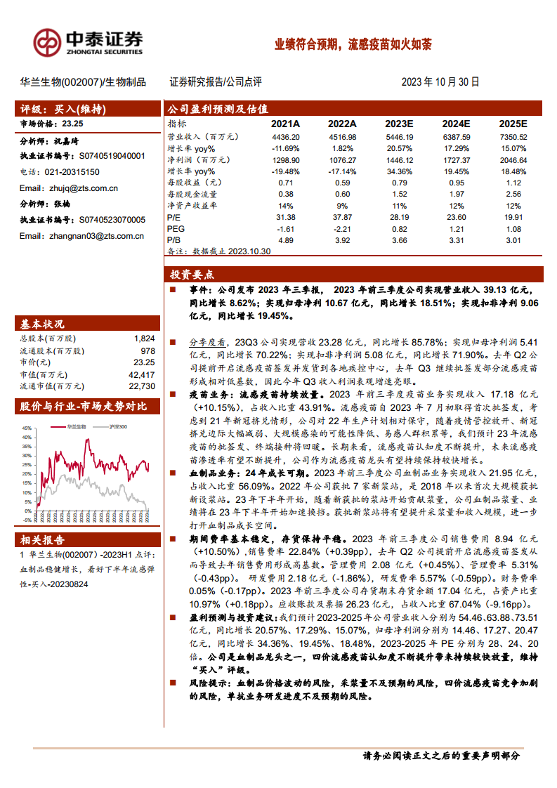 华兰生物2023年前三季度业绩表现强劲,特别是第三季度,营收和归母净利润分别实现85.78%和70.22%的同比高速增长。这主要得益于流感疫苗业务的显著放量和血制品业务的稳健发展。公司预计2023-2025年营业收入和归母净利润将持续保持两位数增长,显示出良好的发展态势和市场潜力。