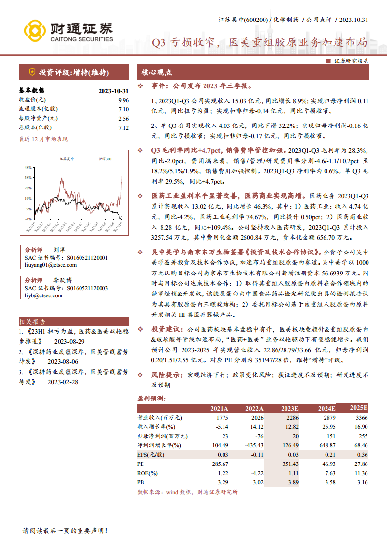 分析师维持对江苏吴中的“增持”投资评级。预计公司2023-2025年营业收入将分别达到22.86亿元、28.79亿元和33.66亿元,归母净利润分别为0.20亿元、1.51亿元和2.55亿元。公司“医药+医美”双轮驱动的业务模式有望在未来实现稳健增长。报告同时提示了宏观经济下行、政策变化、获证进度不及预期以及研发进度不及预期等潜在风险。