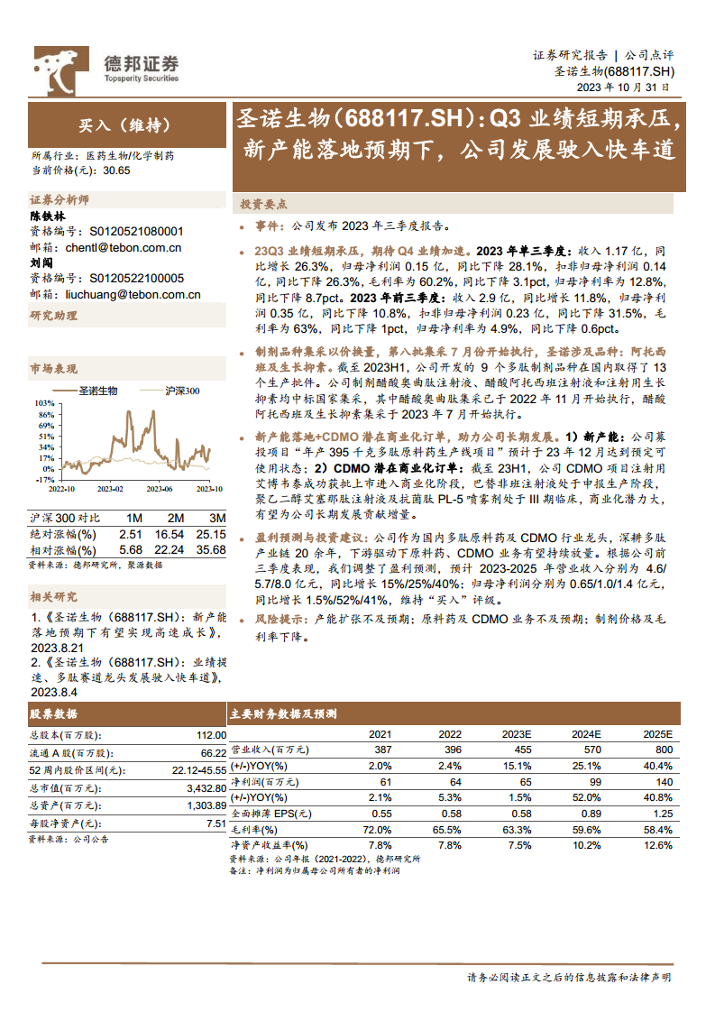 圣诺生物在2023年第三季度面临利润短期承压,主要受制剂品种集采“以价换量”策略的影响,导致归母净利润同比下降28.1%。然而,公司收入仍保持26.3%的同比增长,显示出市场需求的韧性。展望未来,公司核心增长动能在于新产能的落地和CDMO业务的持续拓展。预计“年产395千克多肽原料药生产线项目”将于2023年12月投产,将大幅提升原料药生产能力。同时,注射用艾博韦泰等CDMO项目已进入商业化阶段,多个后期临床项目也具备显著的商业化潜力。分析师据此调整了盈利预测,预计2023-2025年营收和归母净利润将实现稳健增长,特别是2024年和2025年净利润增速预计分别达到52%和41%,因此维持“买入”评级。投资者需关注产能扩张、业务进展及制剂价格波动等潜在风险。