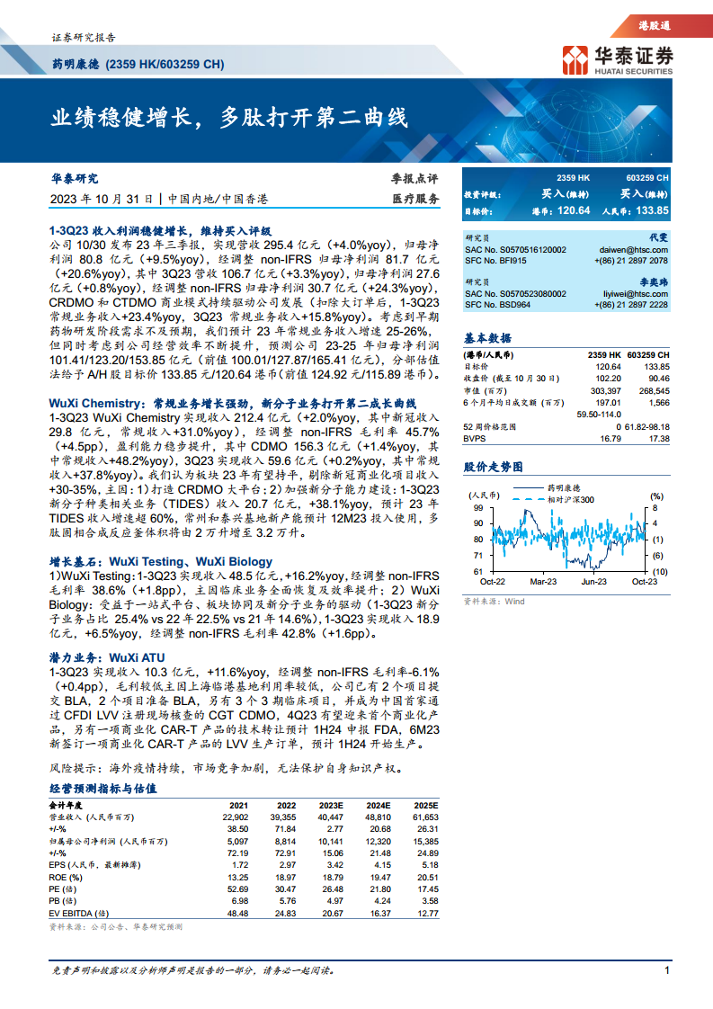 药明康德在2023年前三季度展现出稳健的财务增长,尽管面临早期药物研发需求不及预期的挑战,公司通过持续提升经营效率和优化业务结构,实现了营收和归母净利润的同比增长。华泰研究基于此,维持了对药明康德的“买入”投资评级,并上调了A/H股目标价,反映了市场对其未来增长潜力的认可。
