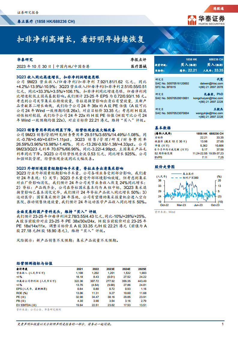 春立医疗在2023年第三季度实现了显著的业绩改善,特别是扣非净利润的高速增长,表明公司已逐步消化集采带来的短期影响,并展现出强劲的恢复势头。通过优化费用结构和加强回款管理,公司经营效率显著提升,经营性现金流大幅改善。展望2024年,随着关节业务的持续放量、脊柱业务的全面恢复以及运动医学等新业务的快速拓展,公司有望迎来业绩的持续增长。华泰研究基于对公司未来增长潜力的看好,维持“买入”评级,并上调A股和H股目标价,认为春立医疗作为国产骨科龙头,具备长期投资价值。
