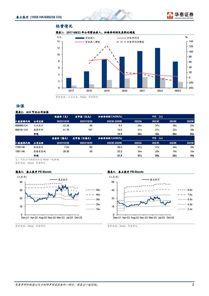 华泰研究维持春立医疗“买入”评级,并上调目标价。考虑到公司关节集采后持续放量、脊柱业务出清影响后有望放量,以及新产品贡献第二增长曲线,给予公司2024年A股36倍PE估值(A股可比公司2024年Wind一致预期均值26倍),对应目标价33.35元人民币。考虑到H股流动性相对较弱,给予公司2024年H股22倍PE估值(H股可比公司2024年Wind一致预期均值22倍),对应目标价22.21港元。当前A股股价对应2023-2025年PE为38x/30x/24x,H股股价对应18x/14x/11x。 主要风险提示包括新产品销售不及预期和集采产品放量不及预期。