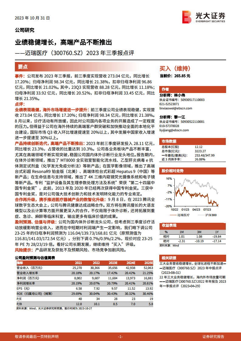 迈瑞医疗在2023年前三季度实现了营收和净利润的稳健增长,尤其在海外市场表现出强劲的增长势头,有效应对了国内诊疗活动放缓带来的短期压力。公司持续的高研发投入和高端产品创新是其核心竞争力,不断丰富的产品线和三次荣获中国专利金奖的成就印证了其强大的技术实力。此外,与腾讯健康的战略合作预示着公司在医疗器械数智化转型方面的积极布局。尽管分析师略微下调了未来盈利预测,但基于其市场地位、创新能力和全球化战略,公司长期发展前景依然被看好,维持“买入”评级。投资者需关注产品研发及市场竞争等潜在风险。