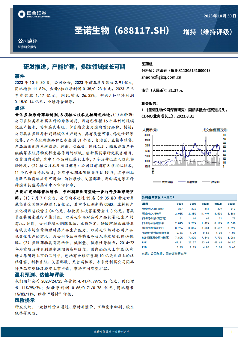 公司在2023年前三季度实现了符合预期的业绩增长,营收和净利润均保持稳健态势。其核心竞争力在于对多肽原料药与制剂领域的深耕,拥有16个规模化生产的仿制药品种和9个广泛销售的制剂品种,并具备8项核心技术和丰富的研发管线。为抓住市场机遇,公司正通过募集资金进行产能扩建,以满足日益增长的市场需求。随着全球重磅多肽药物专利的陆续到期,公司有望凭借其在仿制药领域的优势,进一步打开市场空间。综合来看,公司具备良好的发展前景,但投资者仍需关注潜在的研发、市场竞争及运营风险。
