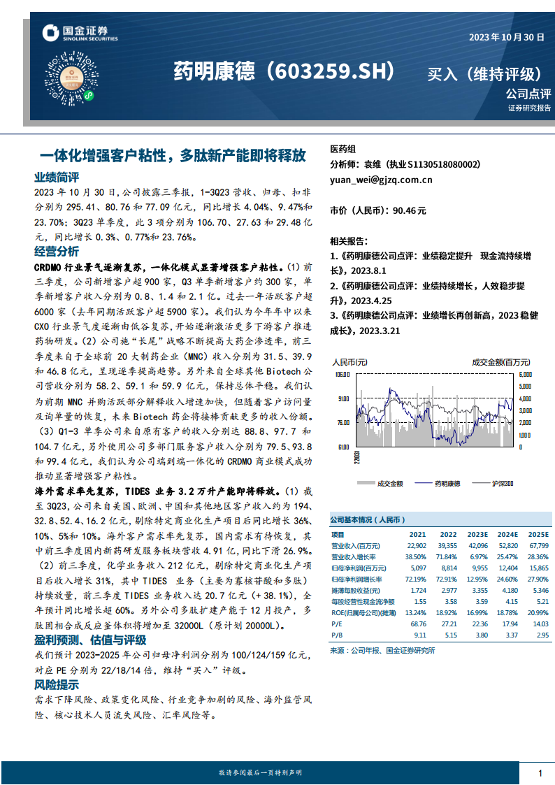 2023年前三季度,公司在复杂市场环境下展现出显著的业绩韧性,营收和归母净利润均实现稳健增长,尤其扣非净利润增幅强劲。这主要得益于其一体化CRDMO(合同研究、开发及生产组织)商业模式的成功推行,该模式有效增强了客户粘性,并驱动了各业务板块的协同发展。公司通过“跟随分子+赢得分子”战略,持续扩张分子管线,尤其在化学业务和TIDES(寡核苷酸和多肽)业务中表现突出。