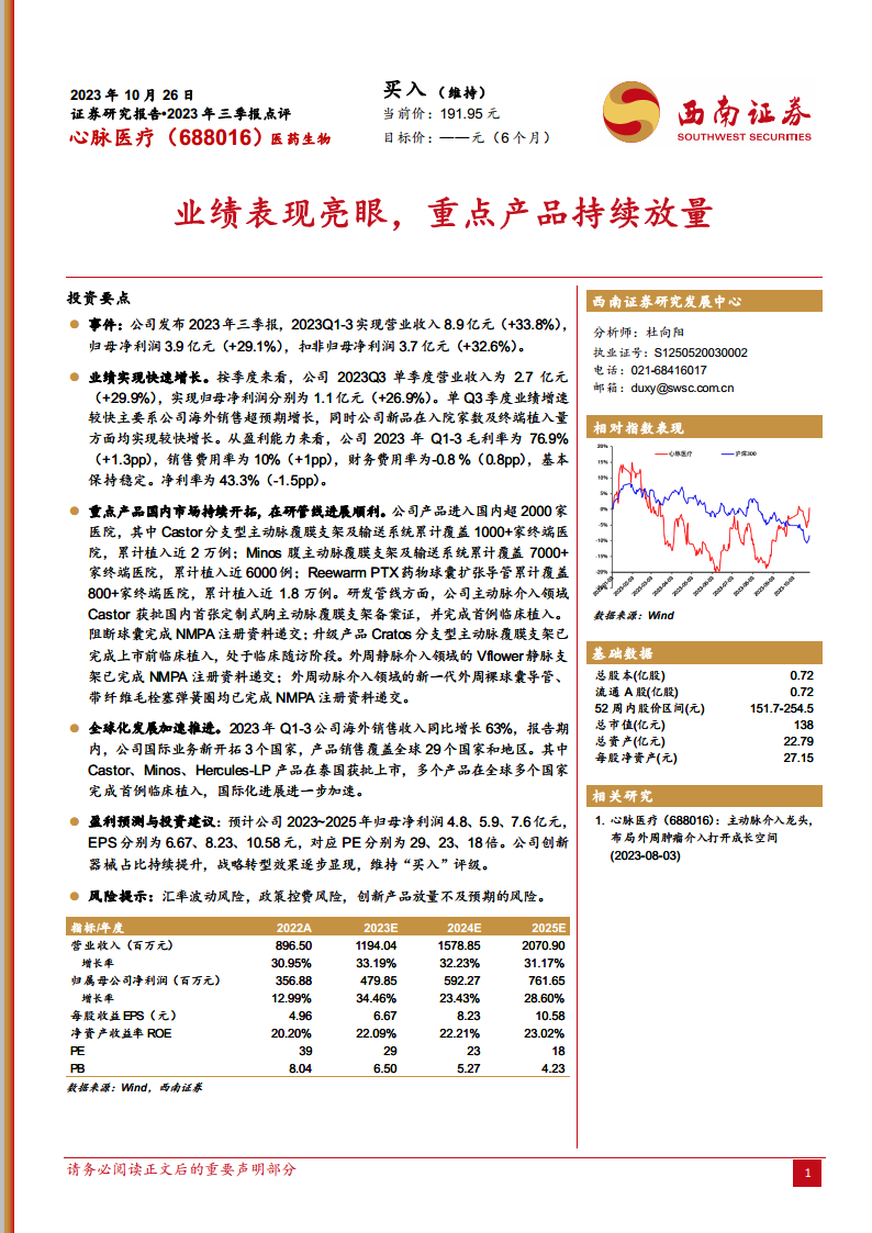 心脉医疗在2023年前三季度实现了显著的业绩增长,营业收入和归母净利润均保持高速增长,主要得益于其核心产品在国内市场的持续渗透和海外业务的强劲扩张。公司在主动脉及外周介入领域的产品线不断丰富,多款在研产品进展顺利,为未来的市场竞争力提供了保障。全球化战略的加速推进,使得公司产品覆盖范围和国际影响力持续扩大。尽管面临汇率波动、政策控费及新产品放量不及预期等风险,但鉴于其创新驱动和战略转型成效,分析师维持“买入”评级,并对其未来盈利能力持积极展望。