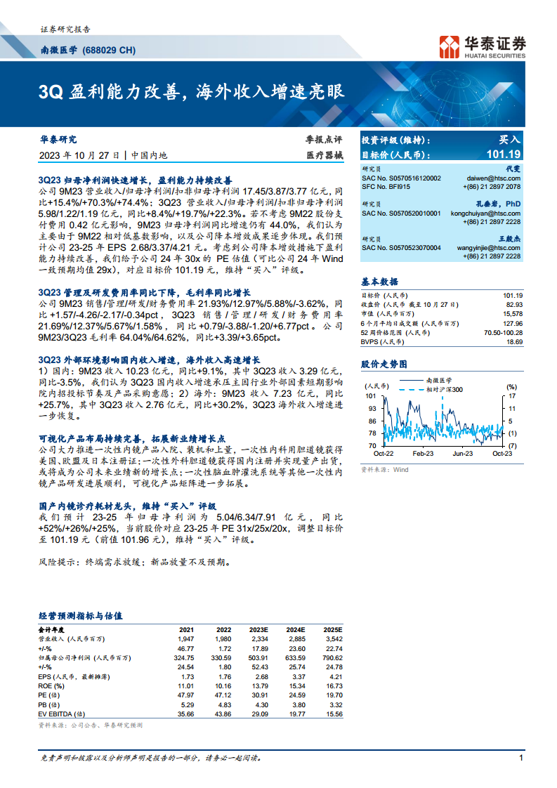 公司持续优化可视化产品布局,一次性内镜产品入院、装机和上量工作进展顺利,多款一次性内镜产品获得国内外注册证并实现量产出货,预示着未来业绩新的增长点。基于盈利能力的持续改善和新产品的市场潜力,华泰研究维持“买入”评级,并设定目标价为101.19元人民币。
